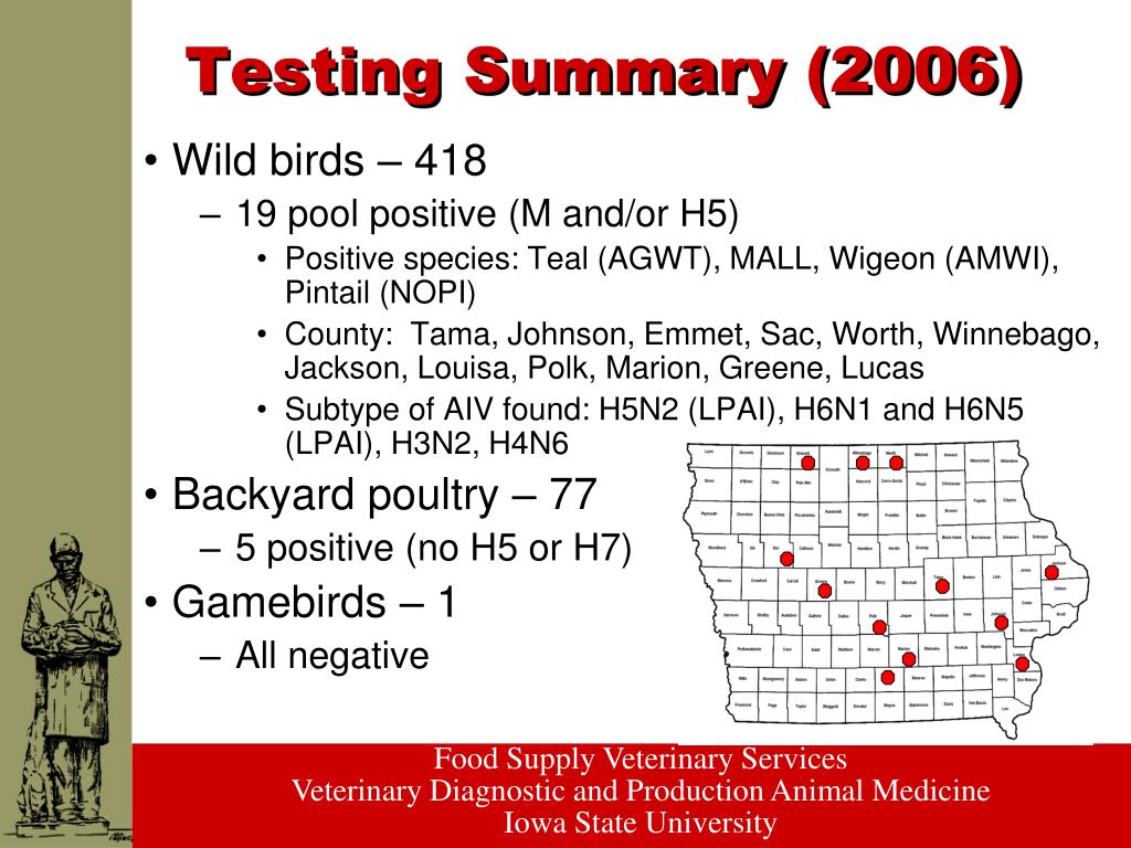 Testing Summary (2006) • Wild birds – 418 • 19 pool positive (M and/or H5) • Positive species: Teal (AGWT), MALL, Wigeon (AMWI), Pintail (NOPI) • County: Tama, Johnson, Emmet, Sac, Worth, Winnebago, Jackson, Louisa, Polk, Marion, Greene, Lucas • Subtype of AIV found: H5N2 (LPAI), H6N1 and H6N5 (LPAI), H3N2, H4N6 • Backyard poultry – 77 • 5 positive (no H5 or H7) • Gamebirds – 1 • All negative