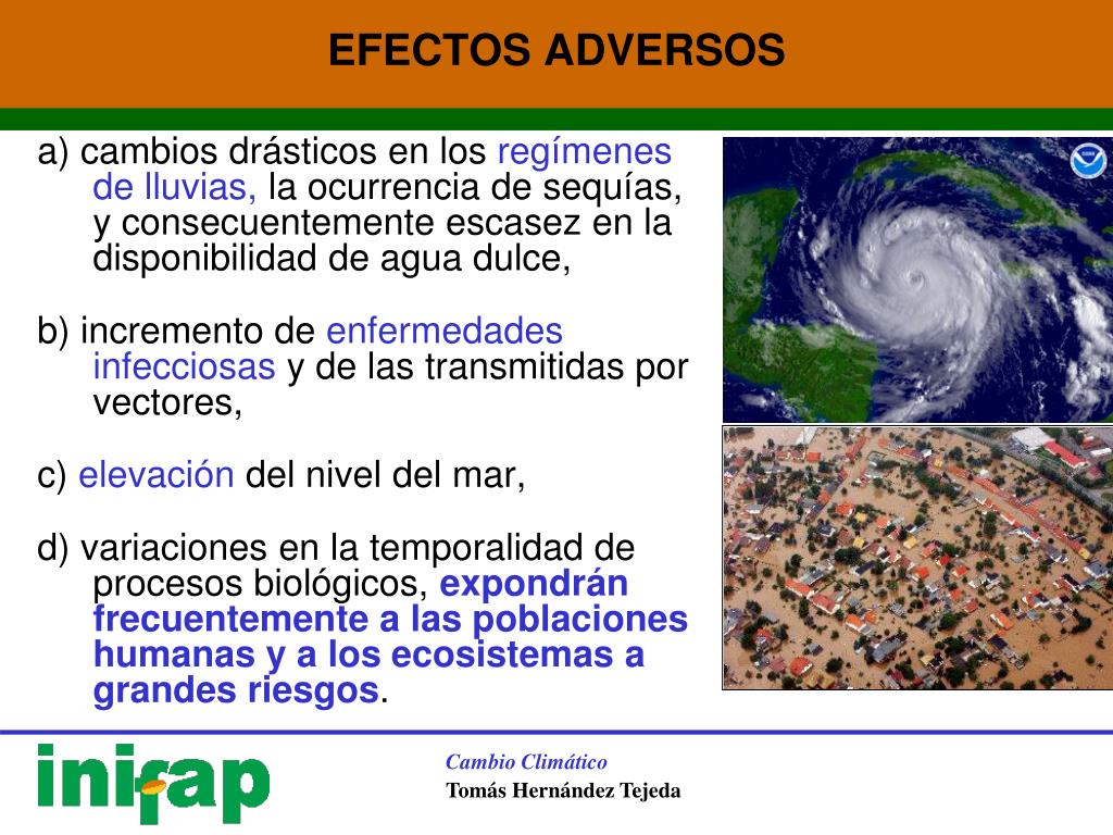 EFECTOS ADVERSOS a) cambiosdrásticosen los regímenes delluvias, la ocurrencia de sequías, y consecuentemente escasez en la disponibilidad de agua dulce, b) incremento de enfermedadesinfecciosas y de las transmitidas por vectores, c) elevación del nivel del mar, d) variaciones en la temporalidad de procesos biológicos, expondrán frecuentemente a las poblaciones humanas y a los ecosistemas a grandes riesgos.
