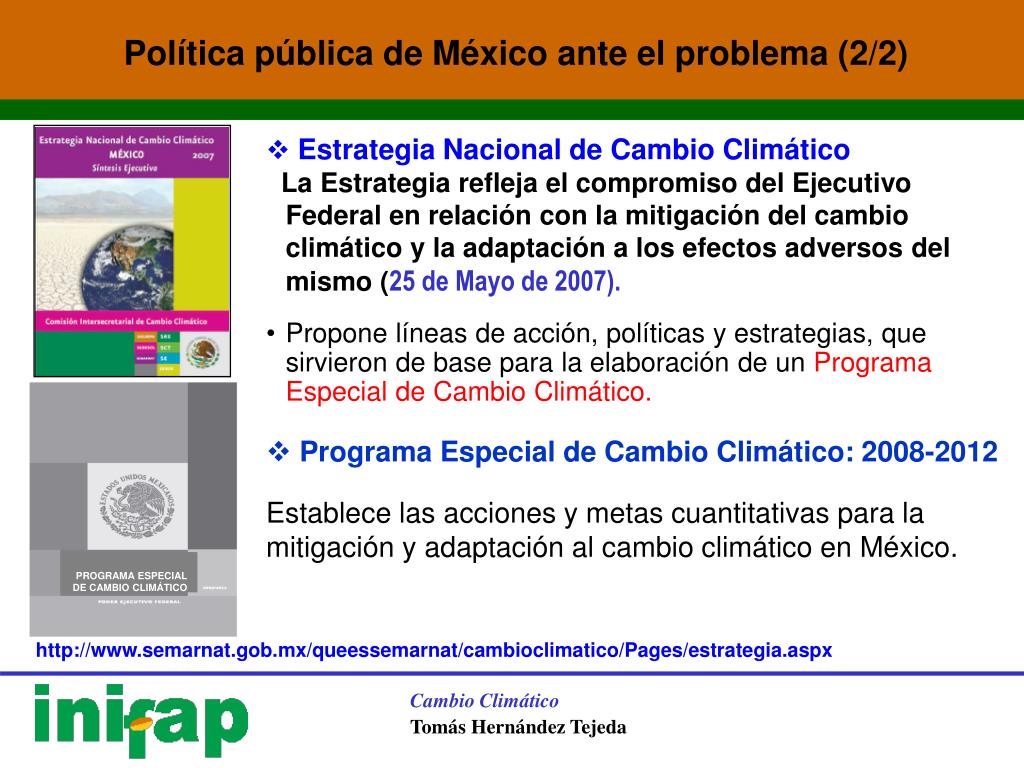 Política pública de México ante el problema (1/2) • Plan Nacional de Desarrollo 2007-2012 • Eje 4. Sustentabilidad Ambiental • 4.6 Cambio climático • OBJETIVO 10 • Reducir las emisiones de Gases de Efecto Invernadero (GEI) • OBJETIVO 11 • Impulsar medidas de adaptación a los efectos del cambio climático • Los Programas Sectoriales 2007-2012, como el de Medio Ambiente y Recursos Naturales y el de SAGARPA,abordan explícitamente el cambio climático. • Comisión Intersecretarial de Cambio Climático • Fue creada para formular e instrumentar políticas nacionales para la prevención y mitigación de emisiones de GEI, la adaptación a los efectos adversos del cambio climático y, en general, para promover el desarrollo de programas y estrategias de acción climática relativos al cumplimiento de los compromisos suscritos por México en la Convención Marco de las Naciones Unidas sobre Cambio Climático (CMNUCC) y demás instrumentos derivados de ella, particularmente el Protocolo de Kioto.