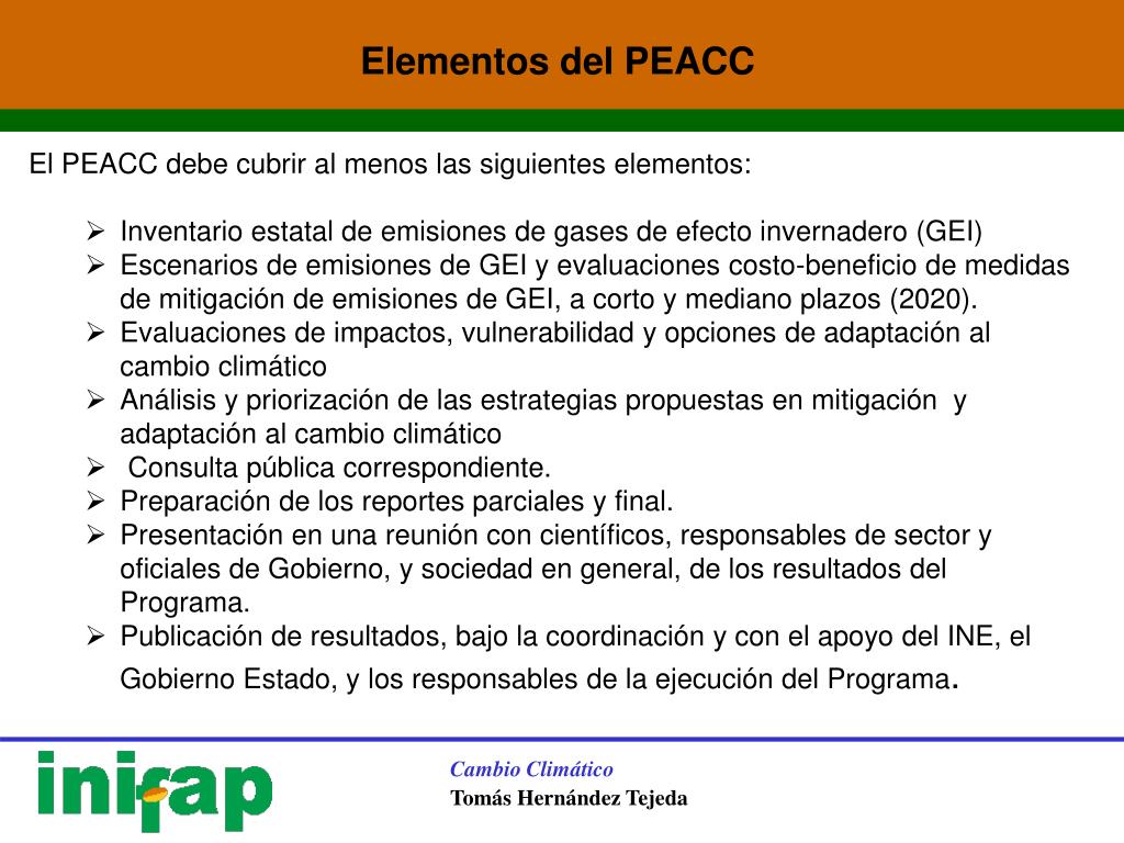 Elementos del PEACC • El PEACC debe cubrir al menos las siguientes elementos: • Inventario estatal de emisiones de gases de efecto invernadero (GEI) • Escenarios de emisiones de GEI y evaluaciones costo-beneficio de medidas de mitigación de emisiones de GEI, a corto y mediano plazos (2020). • Evaluaciones de impactos, vulnerabilidad y opciones de adaptación al cambio climático • Análisis y priorización de las estrategias propuestas en mitigación y adaptación al cambio climático • Consulta pública correspondiente. • Preparación de los reportes parciales y final. • Presentación en una reunión con científicos, responsables de sector y oficiales de Gobierno, y sociedad en general, de los resultados del Programa. • Publicación de resultados, bajo la coordinación y con el apoyo del INE, el Gobierno Estado, y los responsables de la ejecución del Programa.