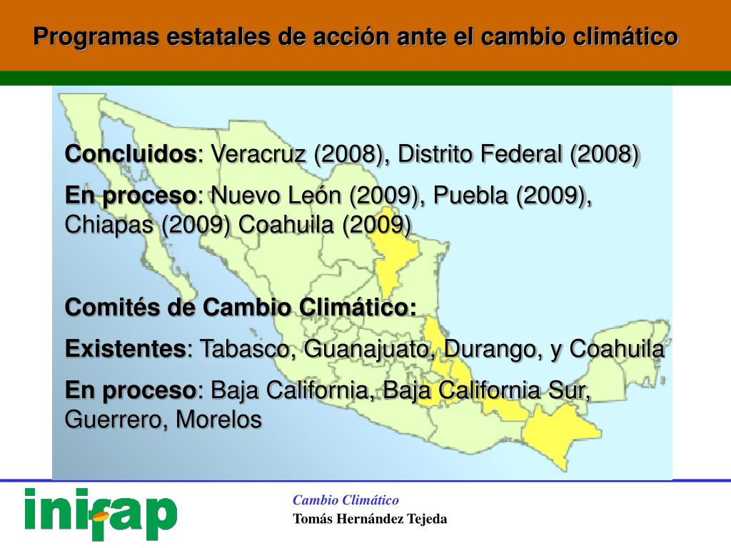 Programas estatales de acción ante el cambio climático Concluidos: Veracruz (2008), Distrito Federal (2008) En proceso: Nuevo León (2009), Puebla (2009), Chiapas (2009) Coahuila (2009) Comités de Cambio Climático: Existentes: Tabasco, Guanajuato, Durango, y Coahuila En proceso: Baja California, Baja California Sur, Guerrero, Morelos