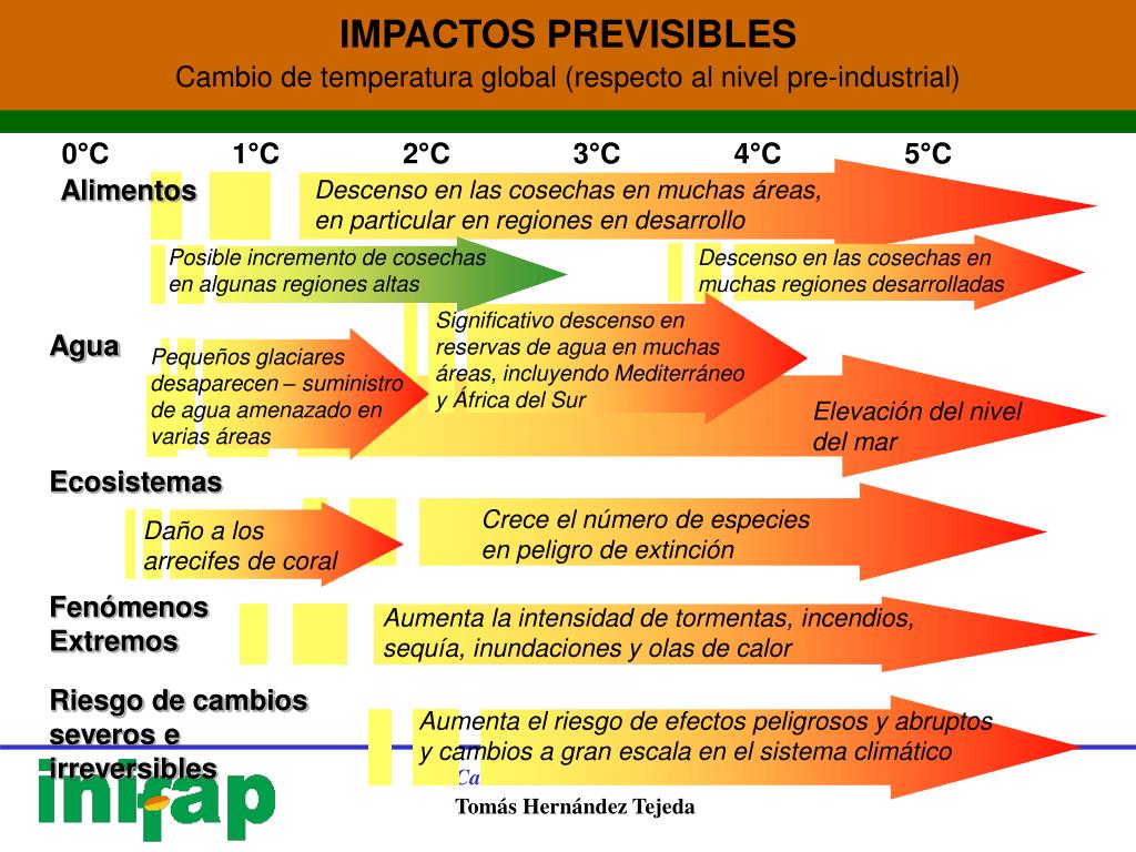 IMPACTOS PREVISIBLES 0°C 1°C 2°C 3°C 4°C 5°C Cambio de temperatura global (respecto al nivel pre-industrial) Alimentos Descenso en las cosechas en muchas áreas, en particular en regiones en desarrollo Posible incremento de cosechas en algunas regiones altas Descenso en las cosechas en muchas regiones desarrolladas Significativo descenso en reservas de agua en muchas áreas, incluyendo Mediterráneo y África del Sur Agua Pequeños glaciares desaparecen – suministro de agua amenazado en varias áreas Elevación del nivel del mar Ecosistemas Crece el número de especies en peligro de extinción Daño a los arrecifes de coral Fenómenos Extremos Aumenta la intensidad de tormentas, incendios, sequía, inundaciones y olas de calor Riesgo de cambios severos e irreversibles Aumenta el riesgo de efectos peligrosos y abruptos y cambios a gran escala en el sistema climático