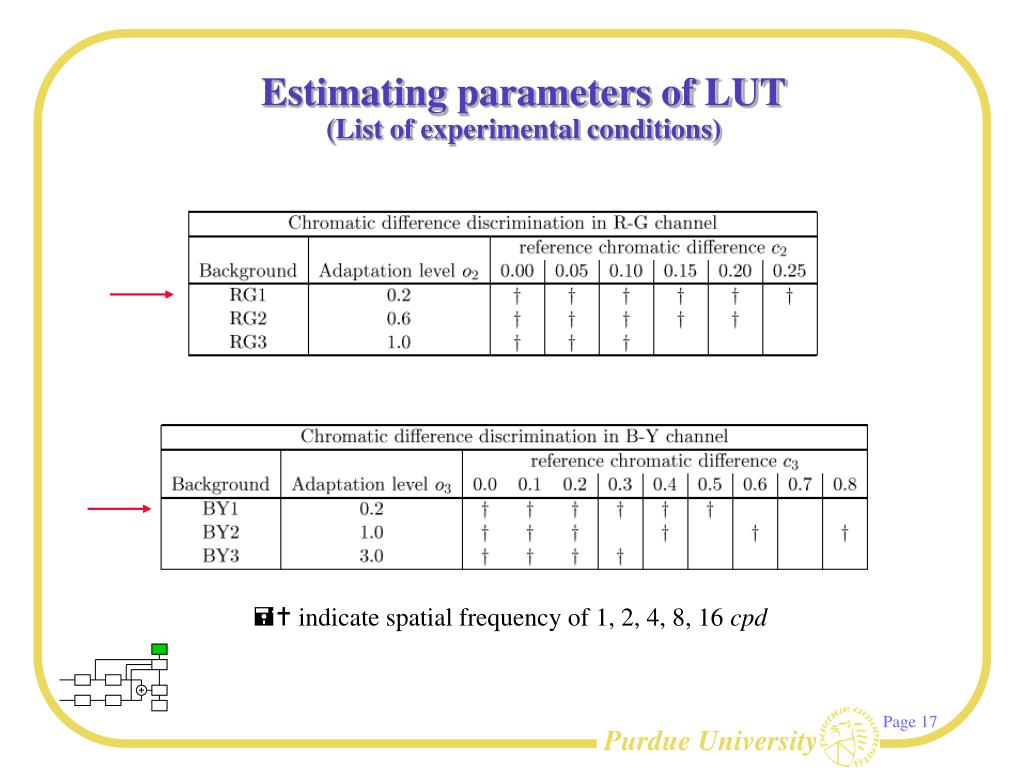 Estimating parameters of LUT(List of experimental conditions) • indicate spatial frequency of 1, 2, 4, 8, 16 cpd