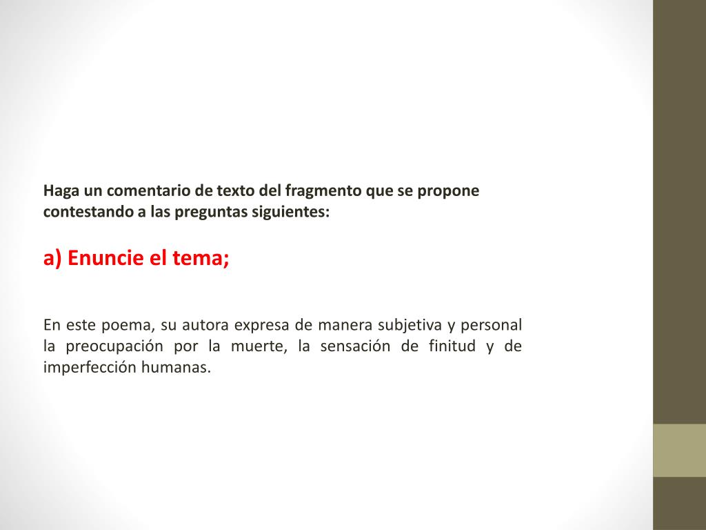 Haga un comentario de texto del fragmento que se propone contestando a las preguntas siguientes: a) Enuncie el tema; En este poema, su autora expresa de manera subjetiva y personal la preocupación por la muerte, la sensación de finitud y de imperfección humanas.