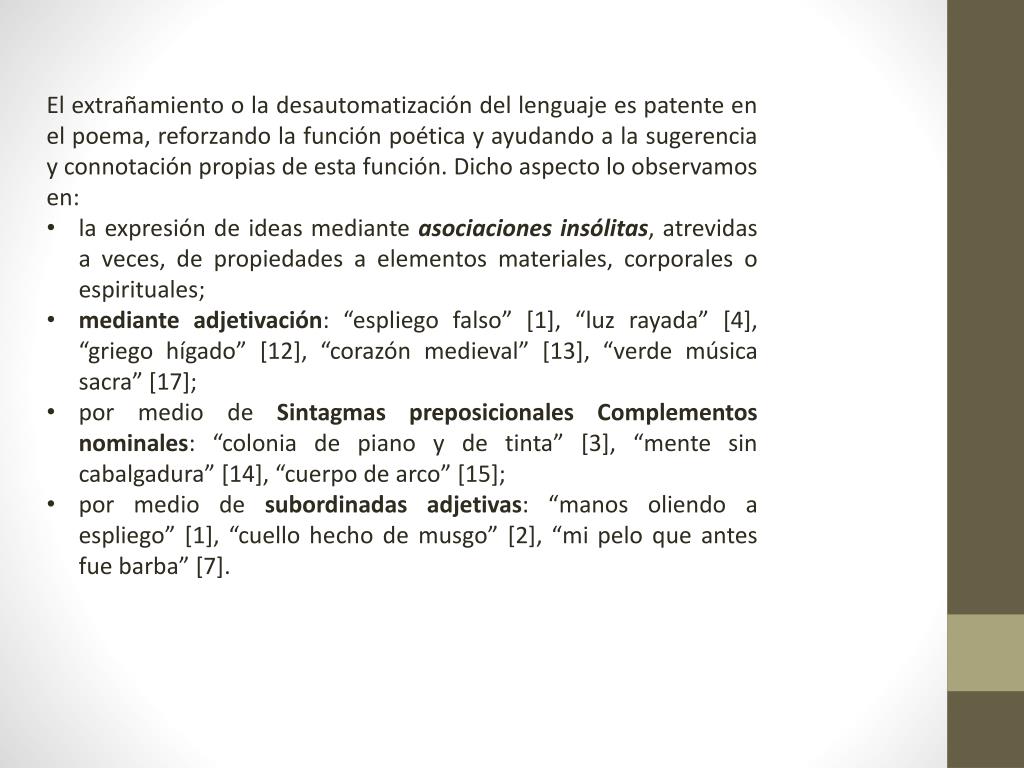 El extrañamiento o la desautomatización del lenguaje es patente en el poema, reforzando la función poética y ayudando a la sugerencia y connotación propias de esta función. Dicho aspecto lo observamos en: • la expresión de ideas mediante asociaciones insólitas, atrevidas a veces, de propiedades a elementos materiales, corporales o espirituales; • mediante adjetivación: “espliego falso” [1], “luz rayada” [4], “griego hígado” [12], “corazón medieval” [13], “verde música sacra” [17]; • por medio de Sintagmas preposicionales Complementos nominales: “colonia de piano y de tinta” [3], “mente sin cabalgadura” [14], “cuerpo de arco” [15]; • por medio de subordinadas adjetivas: “manos oliendo a espliego” [1], “cuello hecho de musgo” [2], “mi pelo que antes fue barba” [7].