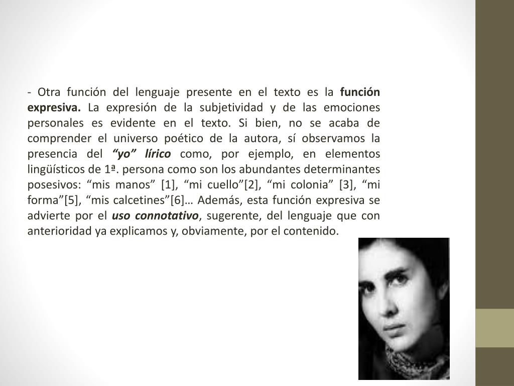 - Otra función del lenguaje presente en el texto es la función expresiva. La expresión de la subjetividad y de las emociones personales es evidente en el texto. Si bien, no se acaba de comprender el universo poético de la autora, sí observamos la presencia del “yo” lírico como, por ejemplo, en elementos lingüísticos de 1ª. persona como son los abundantes determinantes posesivos: “mis manos” [1], “mi cuello”[2], “mi colonia” [3], “mi forma”[5], “mis calcetines”[6]… Además, esta función expresiva se advierte por el uso connotativo, sugerente, del lenguaje que con anterioridad ya explicamos y, obviamente, por el contenido.