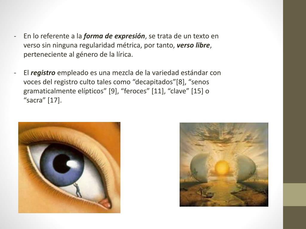 En lo referente a la forma de expresión, se trata de un texto en verso sin ninguna regularidad métrica, por tanto, verso libre, perteneciente al género de la lírica. • El registro empleado es una mezcla de la variedad estándar con voces del registro culto tales como “decapitados”[8], “senos gramaticalmente elípticos” [9], “feroces” [11], “clave” [15] o “sacra” [17].