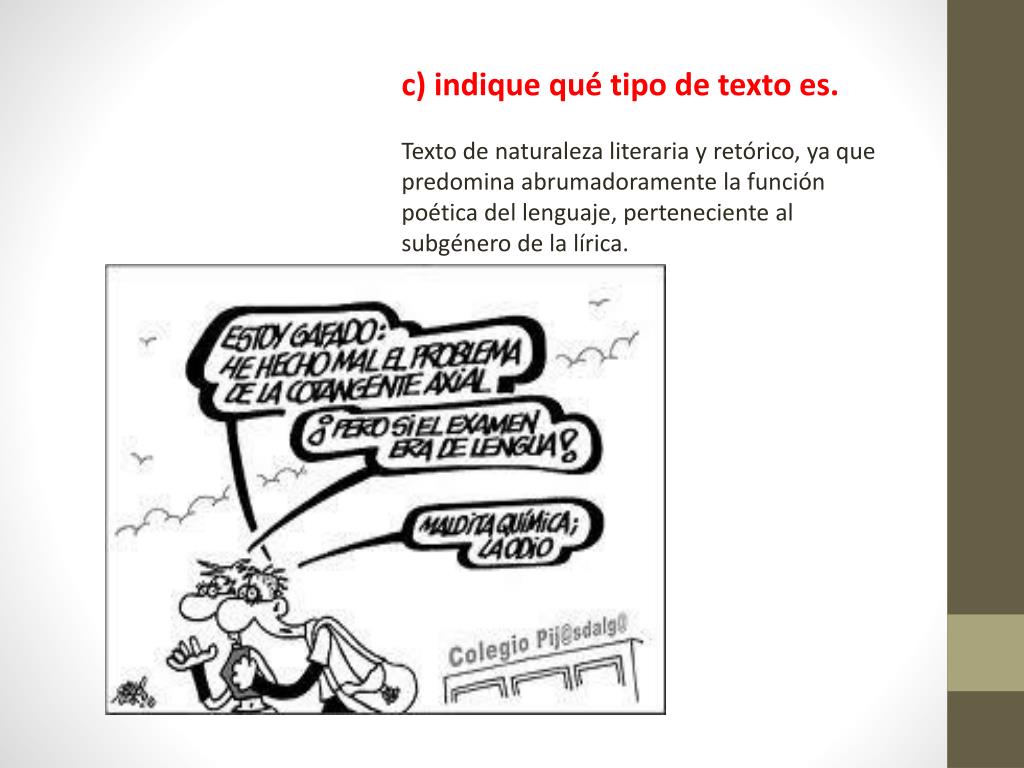 c) indique qué tipo de texto es. Texto de naturaleza literaria y retórico, ya que predomina abrumadoramente la función poética del lenguaje, perteneciente al subgénero de la lírica.