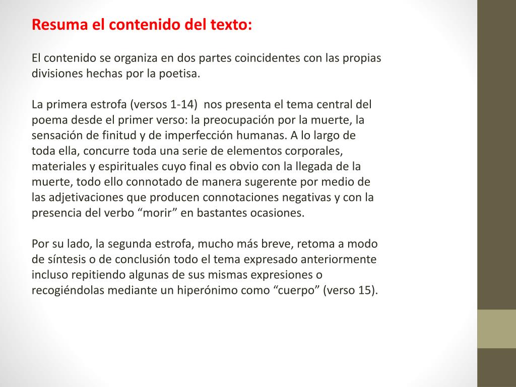 Resuma el contenido del texto: El contenido se organiza en dos partes coincidentes con las propias divisiones hechas por la poetisa. La primera estrofa (versos 1-14) nos presenta el tema central del poema desde el primer verso: la preocupación por la muerte, la sensación de finitud y de imperfección humanas. A lo largo de toda ella, concurre toda una serie de elementos corporales, materiales y espirituales cuyo final es obvio con la llegada de la muerte, todo ello connotado de manera sugerente por medio de las adjetivaciones que producen connotaciones negativas y con la presencia del verbo “morir” en bastantes ocasiones. Por su lado, la segunda estrofa, mucho más breve, retoma a modo de síntesis o de conclusión todo el tema expresado anteriormente incluso repitiendo algunas de sus mismas expresiones o recogiéndolas mediante un hiperónimo como “cuerpo” (verso 15).