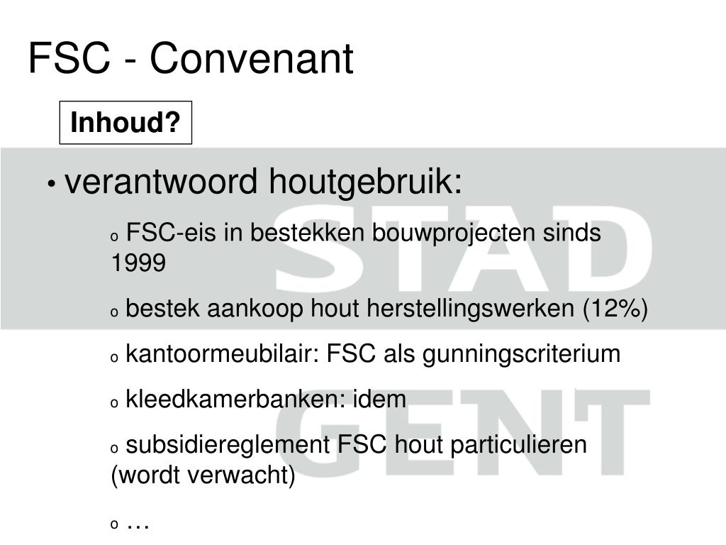 FSC - Convenant Inhoud? • verantwoord houtgebruik: • FSC-eis in bestekken bouwprojecten sinds 1999 • bestek aankoop hout herstellingswerken (12%) • kantoormeubilair: FSC als gunningscriterium • kleedkamerbanken: idem • subsidiereglement FSC hout particulieren (wordt verwacht) • …