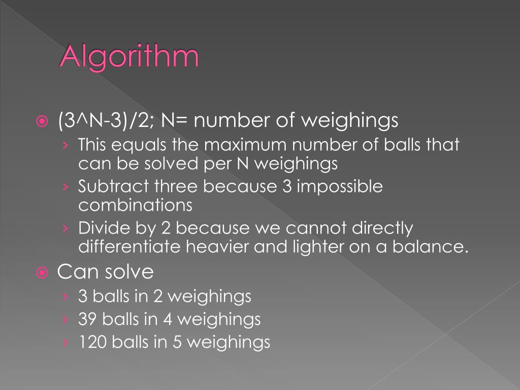 Algorithm • (3^N-3)/2; N= number of weighings • This equals the maximum number of balls that can be solved per N weighings • Subtract three because 3 impossible combinations • Divide by 2 because we cannot directly differentiate heavier and lighter on a balance. • Can solve • 3 balls in 2 weighings • 39 balls in 4 weighings • 120 balls in 5 weighings