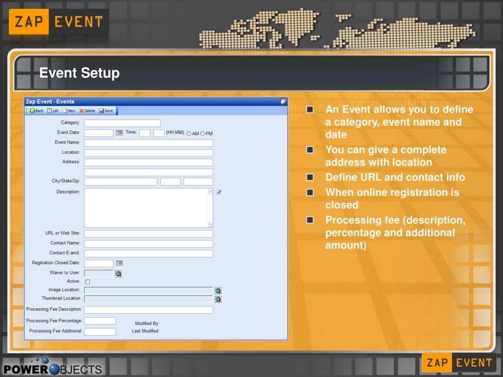 Zap Event Online event registration software that can handle: Racing Events Seminars Class Reunions Meetings Handle any event that requires collecting information and payment!