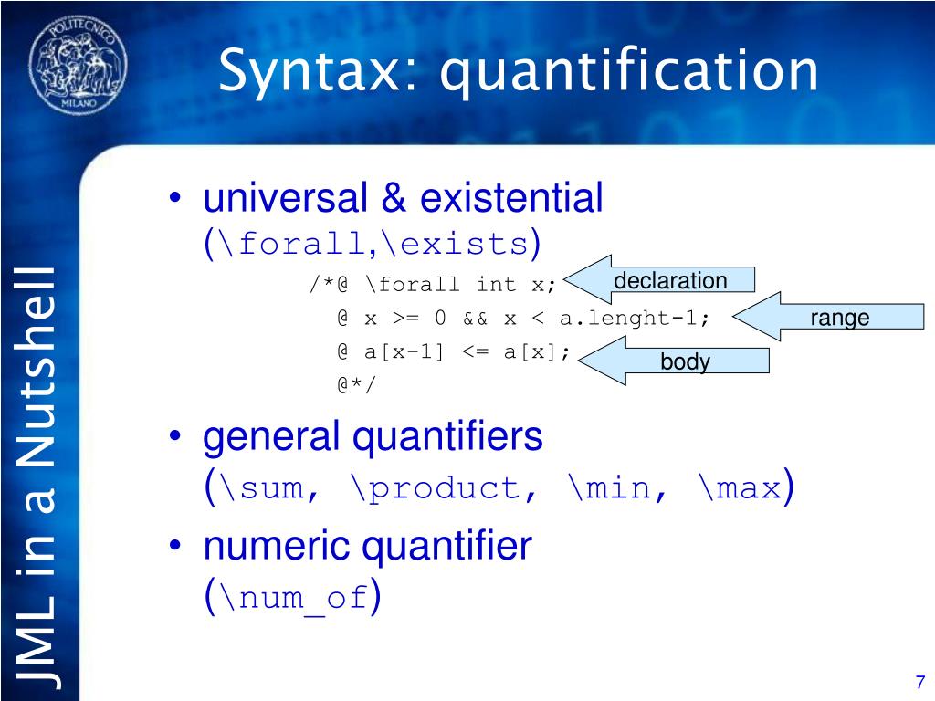 Syntax: quantification • universal & existential (\forall,\exists) /*@ \forall int x; @ x >= 0 && x < a.lenght-1; @ a[x-1] <= a[x]; @*/ • general quantifiers (\sum, \product, \min, \max) • numeric quantifier(\num_of) declaration range body