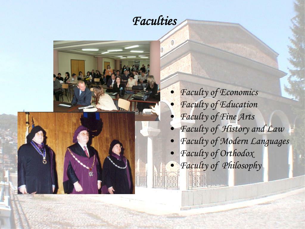 Faculties • Faculty of Economics • Faculty of Education • Faculty of Fine Arts • Faculty of History and Law • Faculty of Modern Languages • Faculty of Orthodox • Faculty of Philosophy