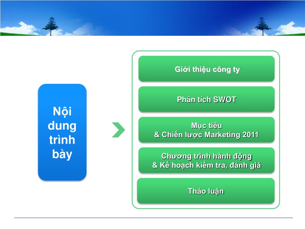 Giới thiệu công ty Phân tích SWOT Mục tiêu & Chiến lược Marketing 2011 Chương trình hành động & Kế hoạch kiểm tra, đánh giá Thảo luận Nội dung trình bày