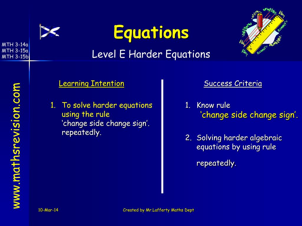 MTH 3-14a MTH 3-15a MTH 3-15b Level E Solving Equations Equations Learning Intention Success Criteria • To solve simple equations using the rule • ‘change side change sign’. • 1. Know rule • ‘change side change sign’. • 2. Solving simple algebraic equations. www.mathsrevision.com Created by Mr.Lafferty Maths Dept