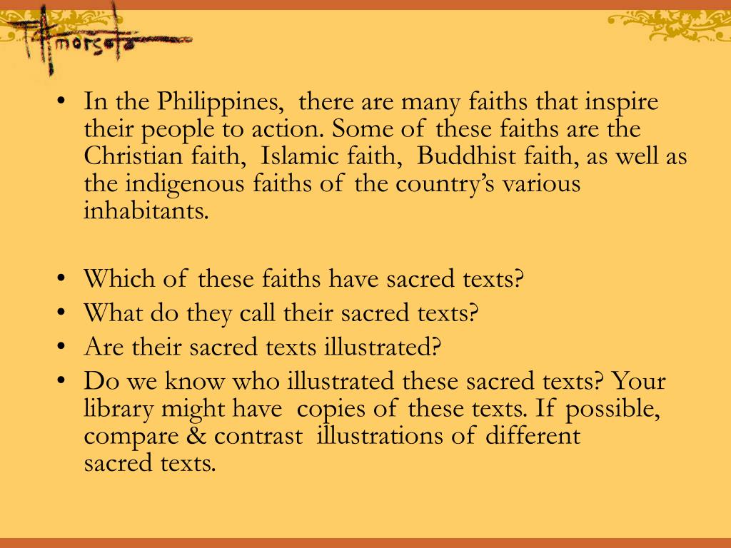 In the Philippines, there are many faiths that inspire their people to action. Some of these faiths are the Christian faith, Islamic faith, Buddhist faith, as well as the indigenous faiths of the country’s various inhabitants. Which of these faiths have sacred texts? What do they call their sacred texts? Are their sacred texts illustrated? Do we know who illustrated these sacred texts? Your library might have copies of these texts. If possible, compare & contrast illustrations of different sacred texts.
