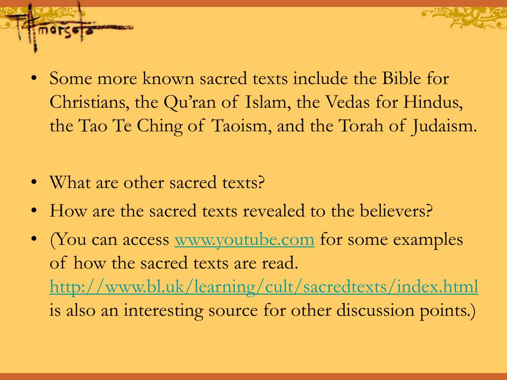 Some more known sacred texts include the Bible for Christians, the Qu’ran of Islam, the Vedas for Hindus, the Tao Te Ching of Taoism, and the Torah of Judaism. What are other sacred texts? How are the sacred texts revealed to the believers? (You can access www.youtube.com for some examples of how the sacred texts are read. http://www.bl.uk/learning/cult/sacredtexts/index.html is also an interesting source for other discussion points.)
