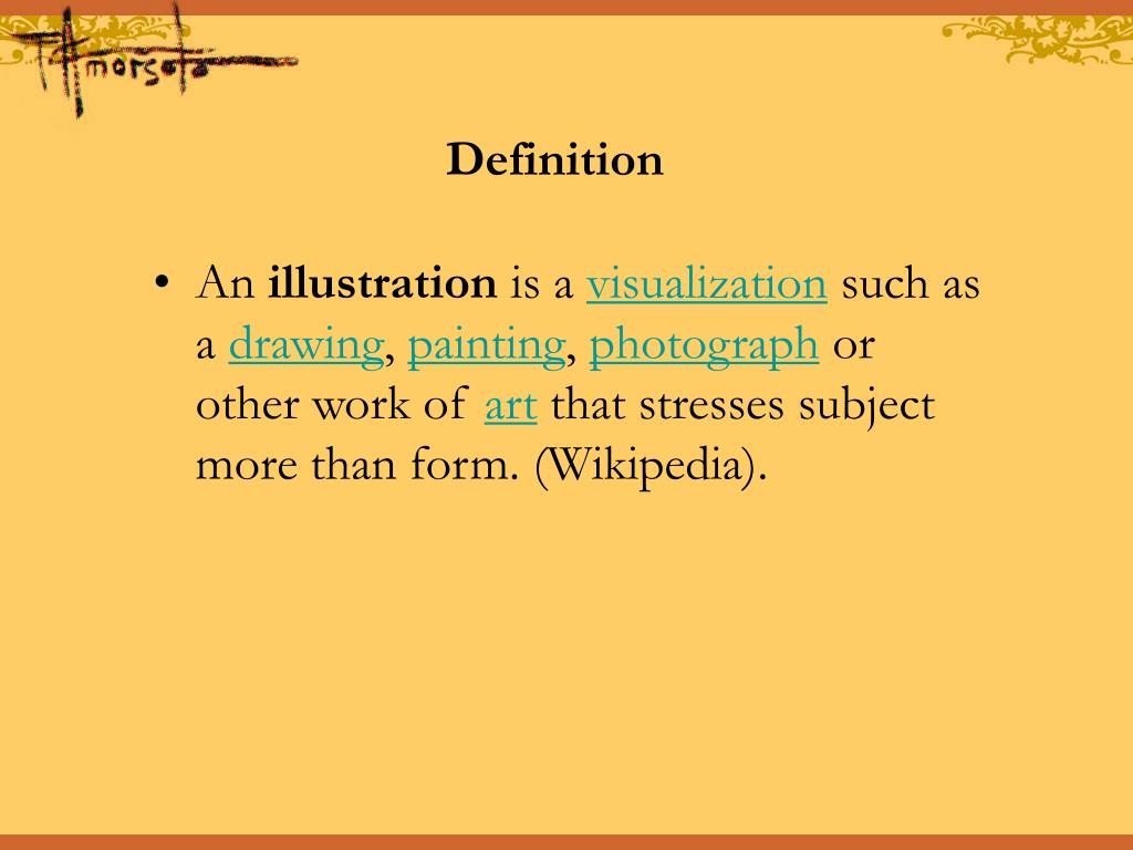 An illustration is a visualization such as a drawing, painting, photograph or other work of art that stresses subject more than form. (Wikipedia). Definition