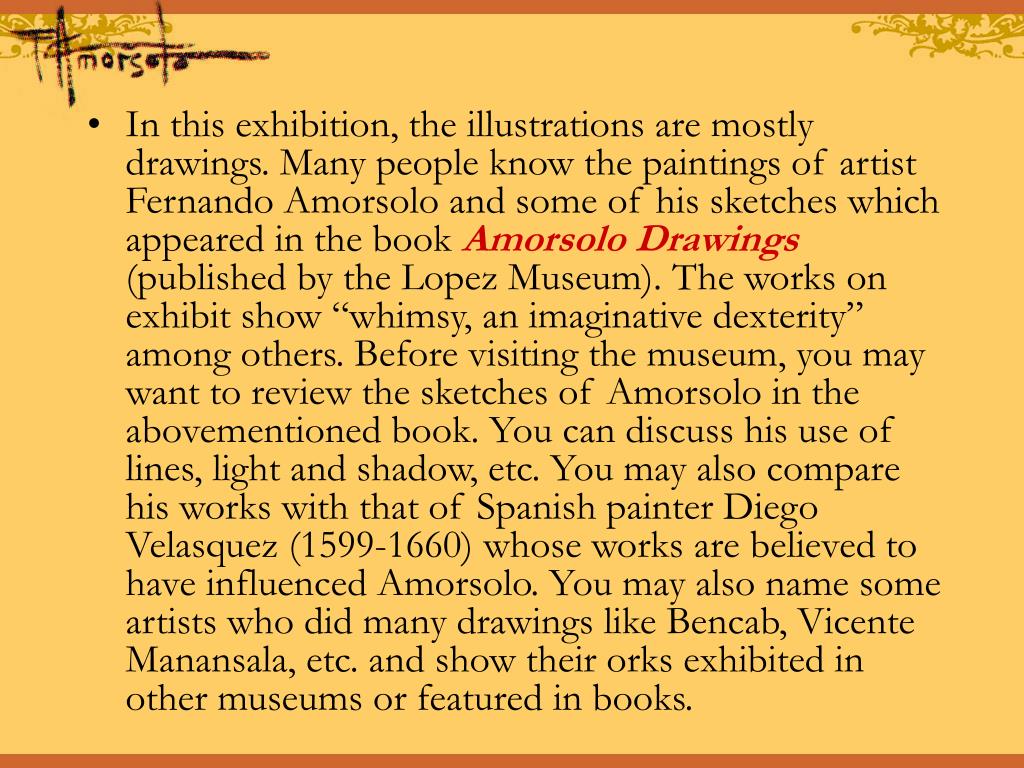 In this exhibition, the illustrations are mostly drawings. Many people know the paintings of artist Fernando Amorsolo and some of his sketches which appeared in the book Amorsolo Drawings (published by the Lopez Museum). The works on exhibit show “whimsy, an imaginative dexterity” among others. Before visiting the museum, you may want to review the sketches of Amorsolo in the abovementioned book. You can discuss his use of lines, light and shadow, etc. You may also compare his works with that of Spanish painter Diego Velasquez (1599-1660) whose works are believed to have influenced Amorsolo. You may also name some artists who did many drawings like Bencab, Vicente Manansala, etc. and show their orks exhibited in other museums or featured in books.