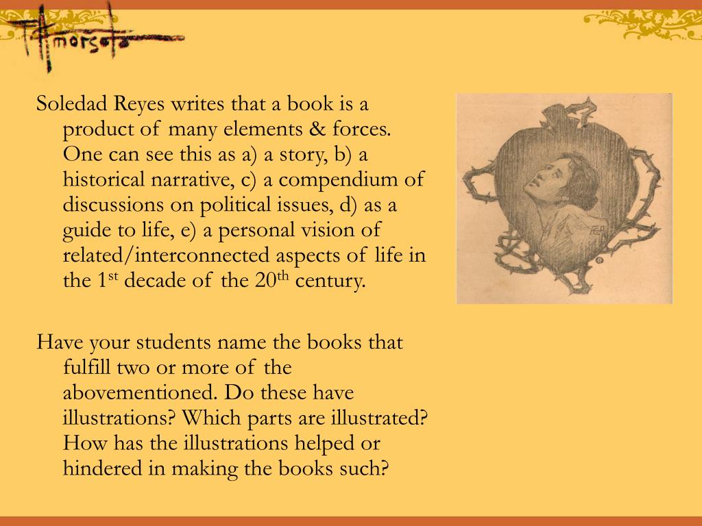 Soledad Reyes writes that a book is a product of many elements & forces. One can see this as a) a story, b) a historical narrative, c) a compendium of discussions on political issues, d) as a guide to life, e) a personal vision of related/interconnected aspects of life in the 1st decade of the 20th century. Have your students name the books that fulfill two or more of the abovementioned. Do these have illustrations? Which parts are illustrated? How has the illustrations helped or hindered in making the books such?