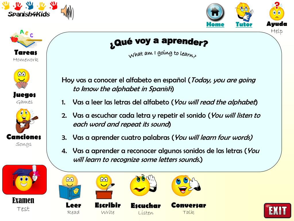 Juegos Games Canciones Songs Tareas Homework Examen Test Leer Read Escribir Write Conversar Talk Escuchar Listen El Alfabeto Juegos