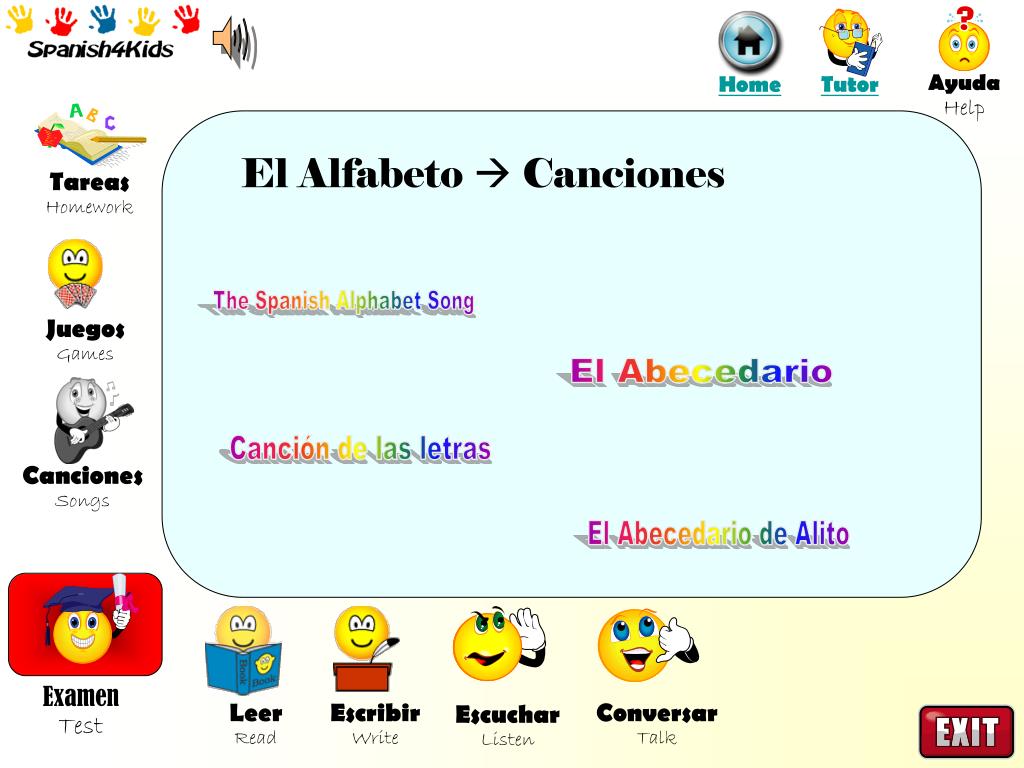 Juegos Games Canciones Songs Tareas Homework Examen Test Leer Read Escribir Write Conversar Talk Escuchar Listen El Alfabeto Canciones The Spanish Alphabet Song El Abecedario Canción de las letras El Abecedario de Alito