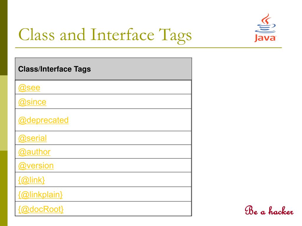 Tags • @author • {@docRoot} • @deprecated • @exception • {@inheritDoc} • {@link} • {@linkplain} • @param • @return • @see • @serial • @serialData • @serialField • @since • @throws • {@value} • @version Be a hacker