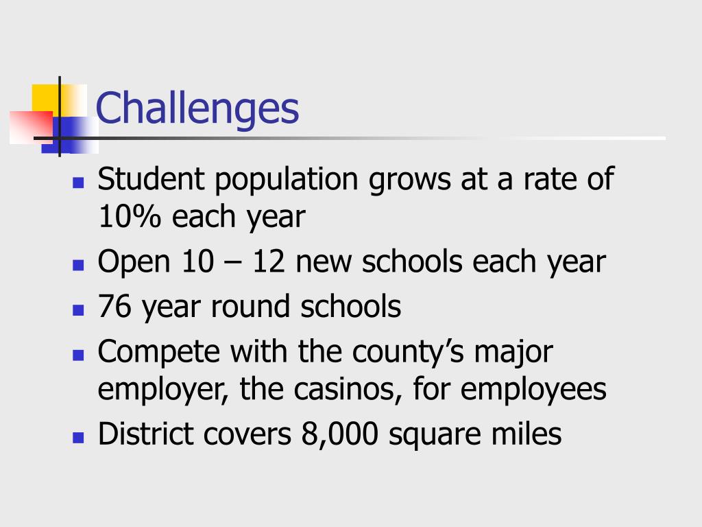 Challenges • Student population grows at a rate of 10% each year • Open 10 – 12 new schools each year • 76 year round schools • Compete with the county’s major employer, the casinos, for employees • District covers 8,000 square miles