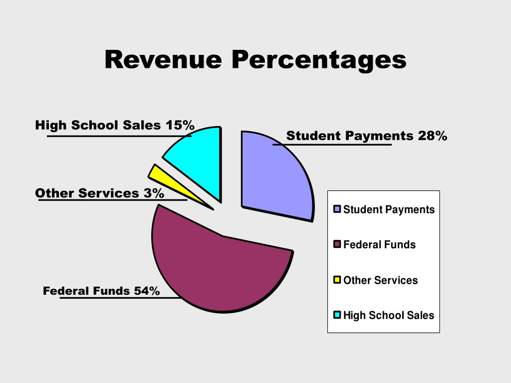 Revenue Percentages High School Sales 15% Student Payments 28% Other Services 3% Federal Funds 54%