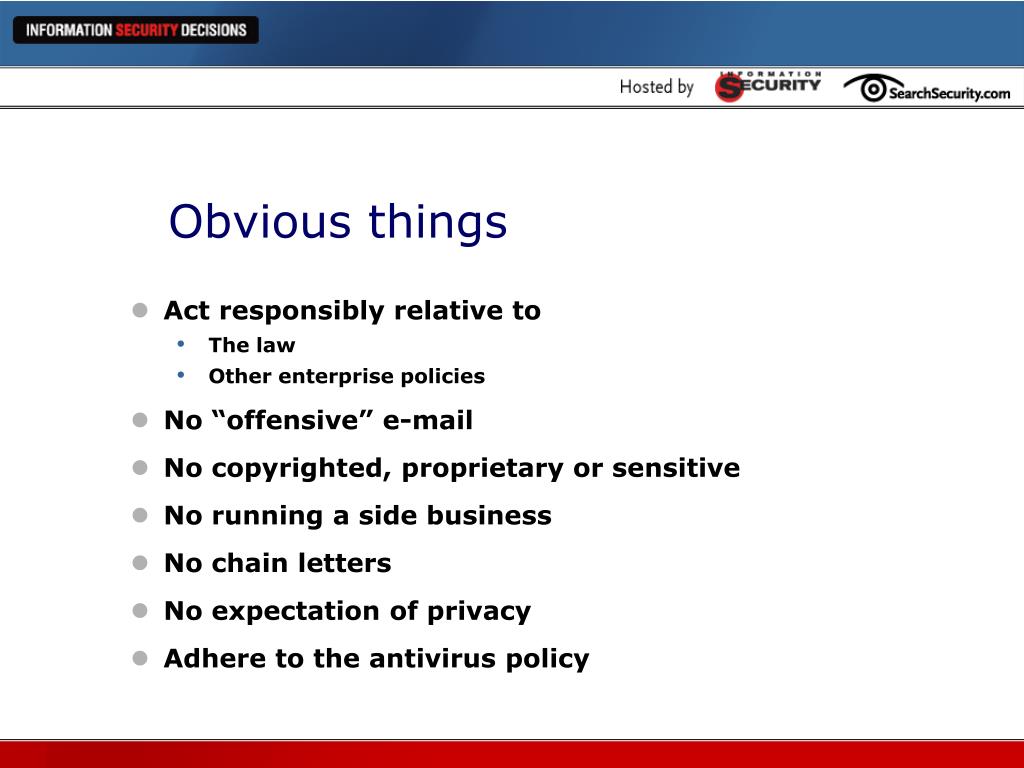 Obvious things • Act responsibly relative to • The law • Other enterprise policies • No “offensive” e-mail • No copyrighted, proprietary or sensitive • No running a side business • No chain letters • No expectation of privacy • Adhere to the antivirus policy