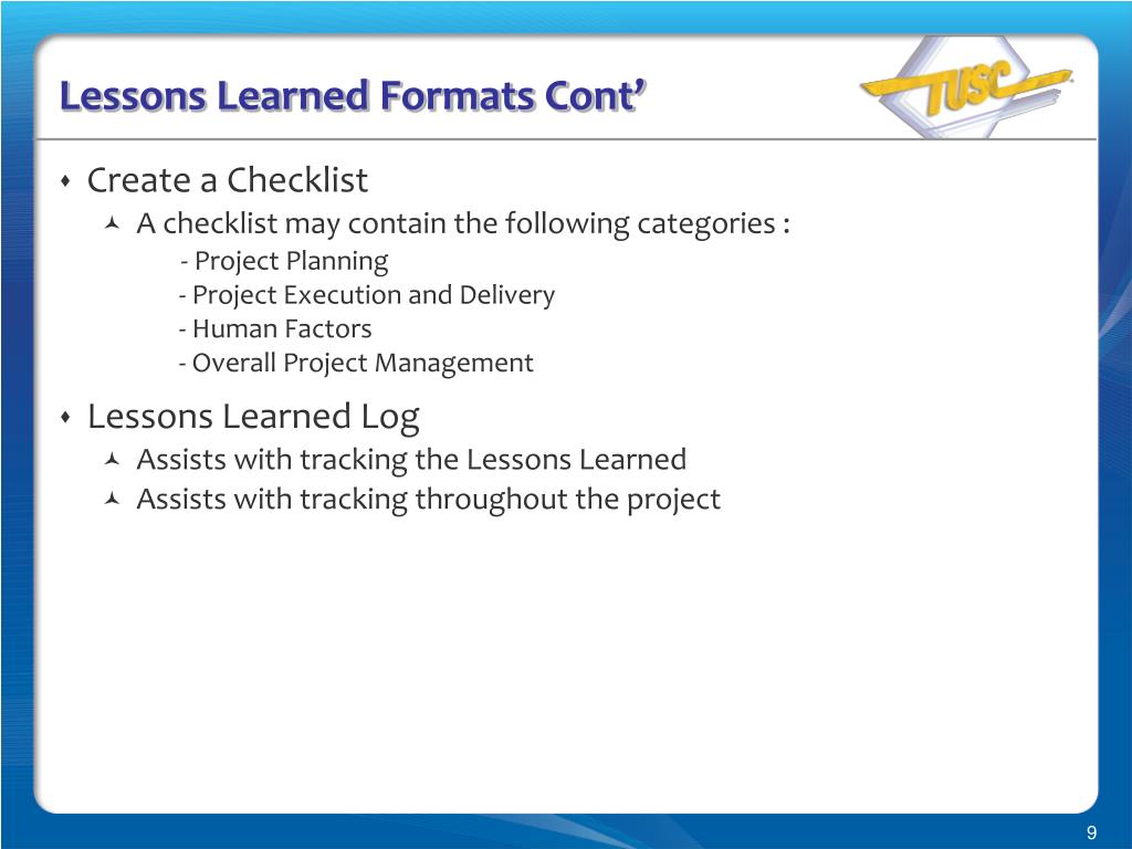 Lessons Learned Formats Cont’ • Create a Checklist • A checklist may contain the following categories : - Project Planning- Project Execution and Delivery- Human Factors- Overall Project Management • Lessons Learned Log • Assists with tracking the Lessons Learned • Assists with tracking throughout the project