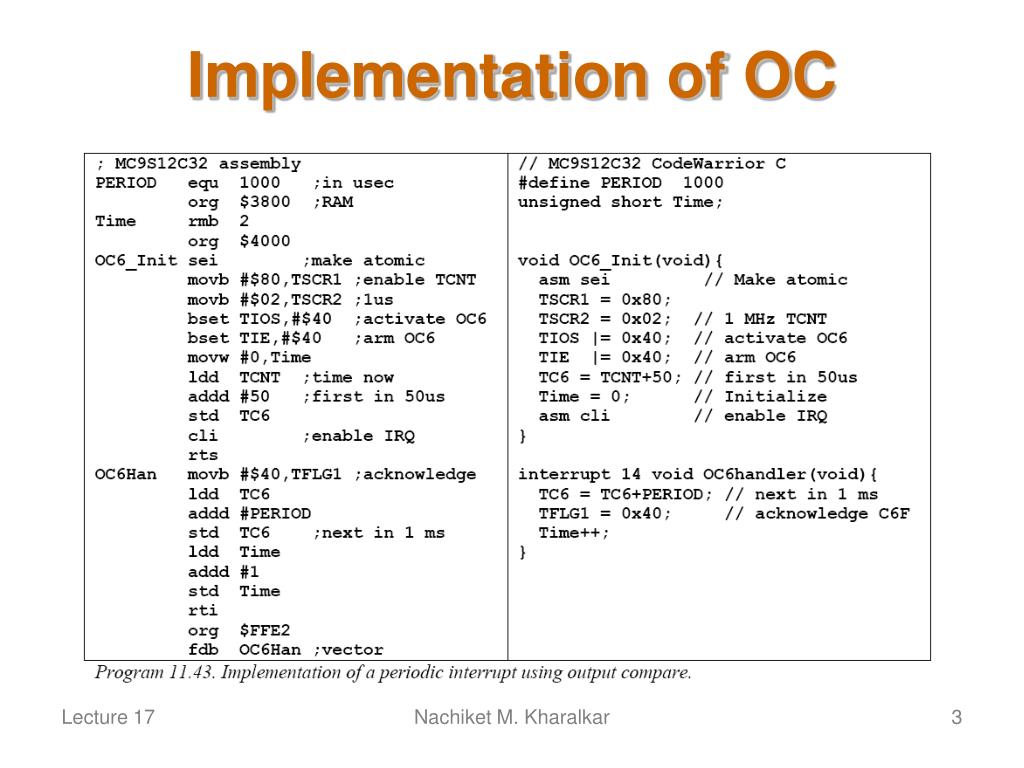 Typical OC handler ;interrupts every 1000 TCNT cycles ;every 1ms TC0handler lddTC0 addd #1000 stdTC0;setp time for next interrupt movb #$01,TFLG1;acknowledge, clear C0F rti Nachiket M. Kharalkar