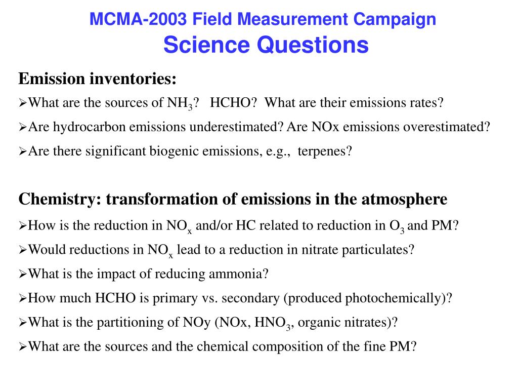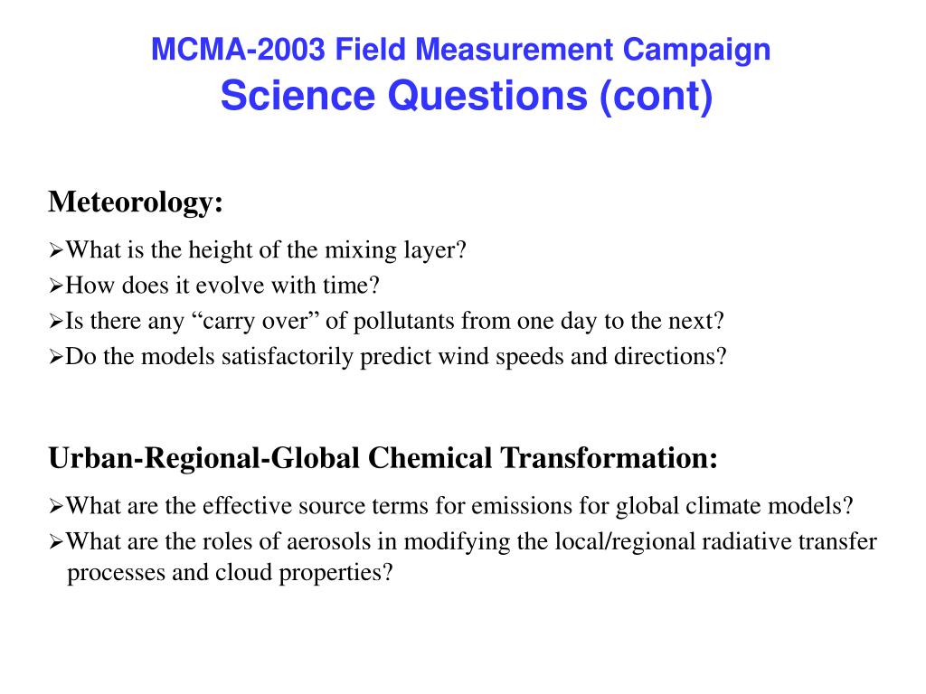 MCMA-2003 Field Measurement Campaign Science Questions (cont) • Meteorology: • What is the height of the mixing layer? • How does it evolve with time? • Is there any “carry over” of pollutants from one day to the next? • Do the models satisfactorily predict wind speeds and directions? • Urban-Regional-Global Chemical Transformation: • What are the effective source terms for emissions for global climate models? • What are the roles of aerosols in modifying the local/regional radiative transfer processes and cloud properties?