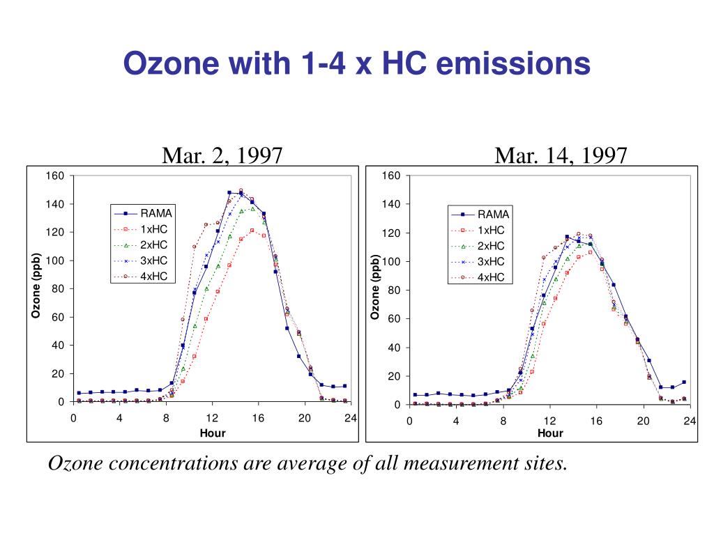 Ozone with 1-4 x HC emissions Mar. 2, 1997 Mar. 14, 1997 Ozone concentrations are average of all measurement sites.
