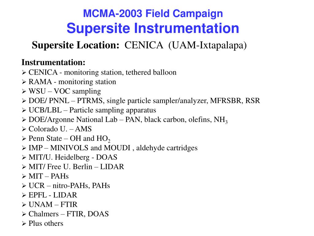 MCMA-2003 Field Campaign Supersite Instrumentation Supersite Location: CENICA (UAM-Ixtapalapa) • Instrumentation: • CENICA - monitoring station, tethered balloon • RAMA - monitoring station • WSU – VOC sampling • DOE/ PNNL – PTRMS, single particle sampler/analyzer, MFRSBR, RSR • UCB/LBL – Particle sampling apparatus • DOE/Argonne National Lab – PAN, black carbon, olefins, NH3 • Colorado U. – AMS • Penn State – OH and HO2 • IMP – MINIVOLS and MOUDI , aldehyde cartridges • MIT/U. Heidelberg - DOAS • MIT/ Free U. Berlin – LIDAR • MIT – PAHs • UCR – nitro-PAHs, PAHs • EPFL - LIDAR • UNAM – FTIR • Chalmers – FTIR, DOAS • Plus others