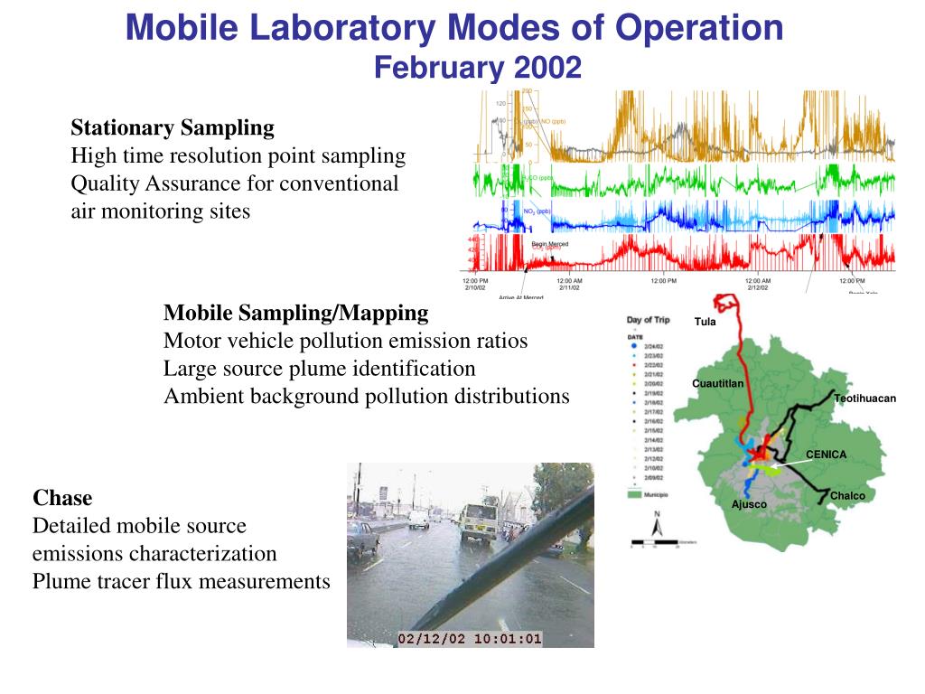 Mobile Laboratory Modes of Operation February 2002 Stationary Sampling High time resolution point sampling Quality Assurance for conventional air monitoring sites Mobile Sampling/Mapping Motor vehicle pollution emission ratios Large source plume identification Ambient background pollution distributions Chase Detailed mobile source emissions characterization Plume tracer flux measurements