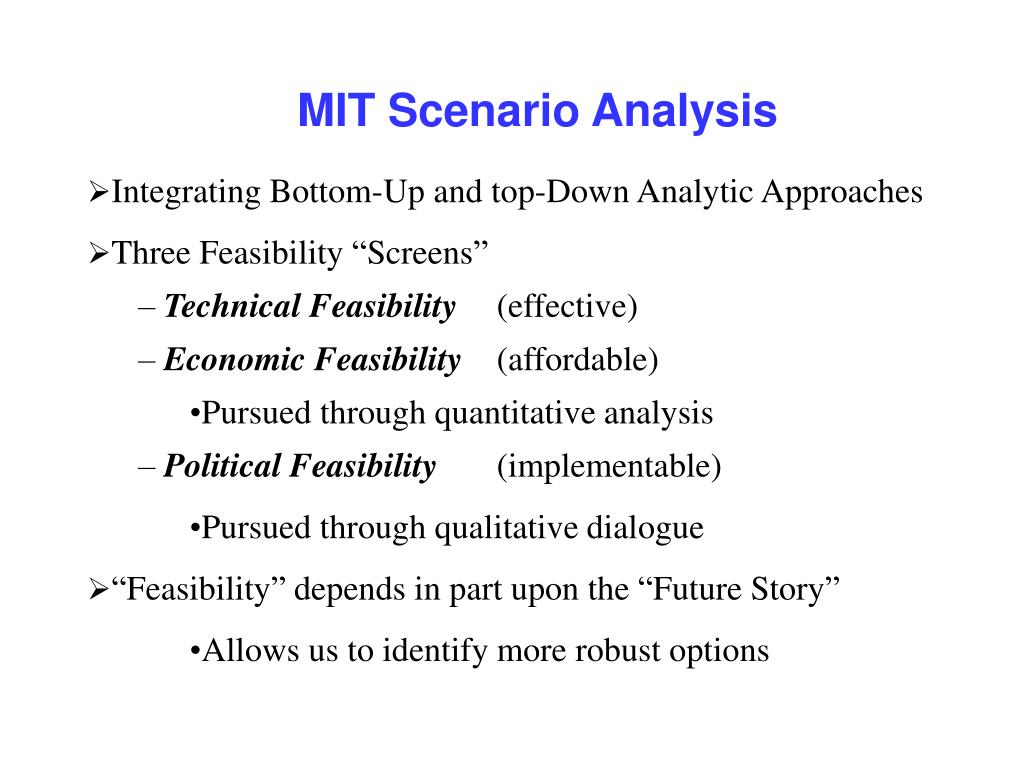 MIT Scenario Analysis • Integrating Bottom-Up and top-Down Analytic Approaches • Three Feasibility “Screens” • Technical Feasibility (effective) • Economic Feasibility (affordable) • Pursued through quantitative analysis • Political Feasibility (implementable) • Pursued through qualitative dialogue • “Feasibility” depends in part upon the “Future Story” • Allows us to identify more robust options