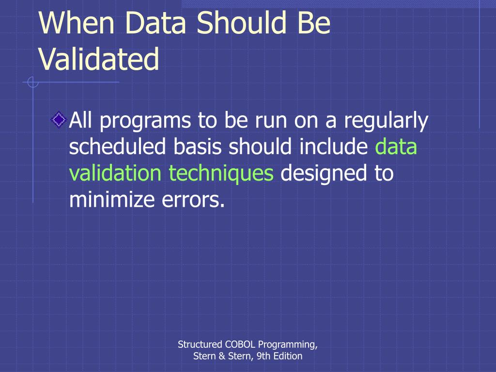 When Data Should Be Validated • All programs to be run on a regularly scheduled basis should include data validation techniques designed to minimize errors. Structured COBOL Programming, Stern & Stern, 9th Edition