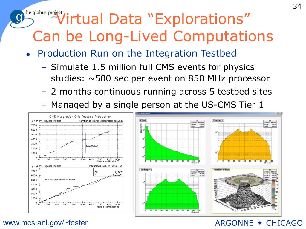 Virtual Data “Explorations” Can be Long-Lived Computations • Production Run on the Integration Testbed • Simulate 1.5 million full CMS events for physics studies: ~500 sec per event on 850 MHz processor • 2 months continuous running across 5 testbed sites • Managed by a single person at the US-CMS Tier 1