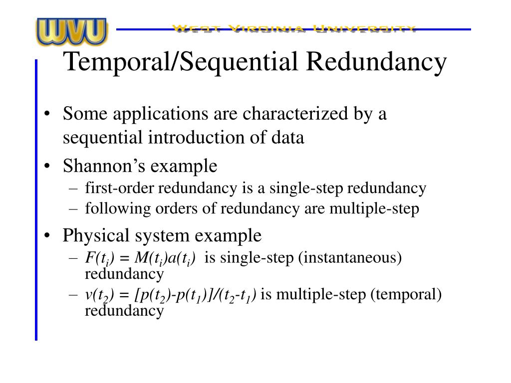 Temporal/Sequential Redundancy • Some applications are characterized by a sequential introduction of data • Shannon’s example • first-order redundancy is a single-step redundancy • following orders of redundancy are multiple-step • Physical system example • F(ti) = M(ti)a(ti) is single-step (instantaneous) redundancy • v(t2) = [p(t2)-p(t1)]/(t2-t1) is multiple-step (temporal) redundancy