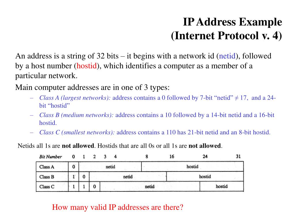 IP Address Example(Internet Protocol v. 4) • An address is a string of 32 bits – it begins with a network id (netid), followed by a host number (hostid), which identifies a computer as a member of a particular network. • Main computer addresses are in one of 3 types: • Class A (largest networks): address contains a 0 followed by 7-bit “netid”≠ 17, and a 24-bit “hostid” • Class B (medium networks): address contains a 10 followed by a 14-bit netid and a 16-bit hostid. • Class C (smallest networks): address contains a 110 has 21-bit netid and an 8-bit hostid. • Netids all 1s are not allowed. Hostids that are all 0s or all 1s are not allowed. How many valid IP addresses are there?