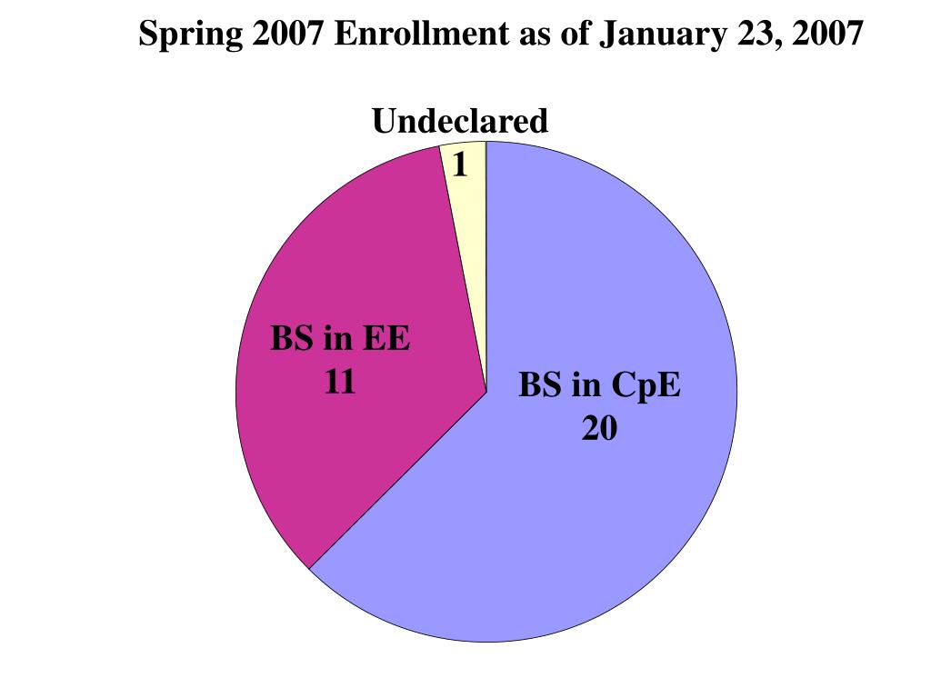 Spring 2007 Enrollment as of January 23, 2007 Undeclared 1 BS in EE 11 BS in CpE 20