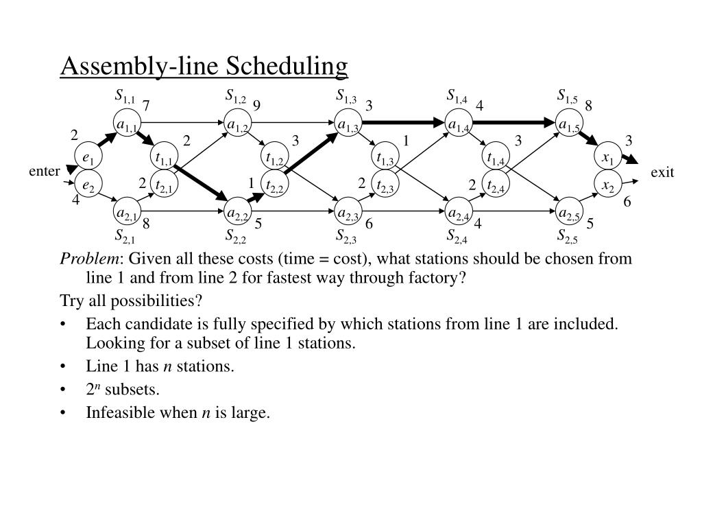 Assembly-line Scheduling S1,1 S1,2 S1,3 S1,4 S1,5 7 9 3 4 8 Problem: Given all these costs (time = cost), what stations should be chosen from line 1 and from line 2 for fastest way through factory? Try all possibilities? • Each candidate is fully specified by which stations from line 1 are included. Looking for a subset of line 1 stations. • Line 1 has n stations. • 2n subsets. • Infeasible when n is large. a1,1 a1,2 a1,3 a1,4 a1,5 2 2 3 1 3 3 e1 t1,1 t1,2 t1,3 t1,4 x1 enter exit e2 2 t2,1 1 t2,2 2 t2,3 t2,4 x2 2 4 6 a2,1 a2,2 a2,3 a2,4 a2,5 8 5 6 4 5 S2,1 S2,2 S2,3 S2,4 S2,5