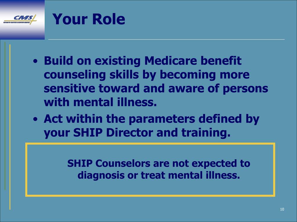 Your Role • Build on existing Medicare benefit counseling skills by becoming more sensitive toward and aware of persons with mental illness. • Act within the parameters defined by your SHIP Director and training. SHIP Counselors are not expected to diagnosis or treat mental illness.