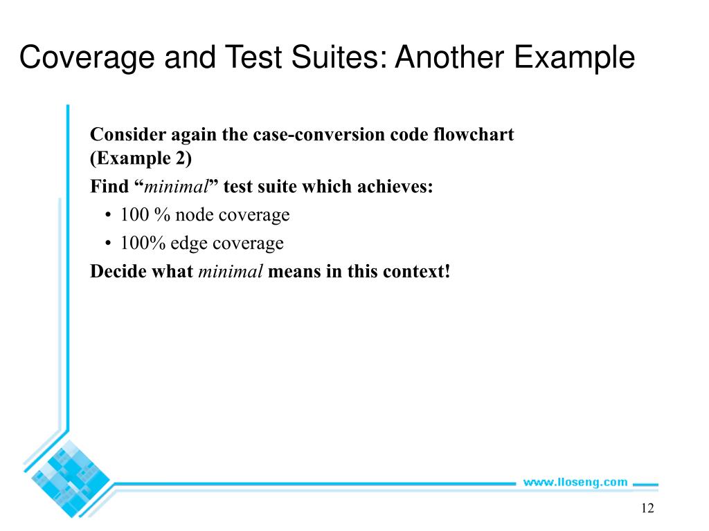 Coverage and Test Suites: Another Example • Consider again the case-conversion code flowchart (Example 2) • Find “minimal” test suite which achieves: • 100 % node coverage • 100% edge coverage • Decide what minimalmeans in this context!