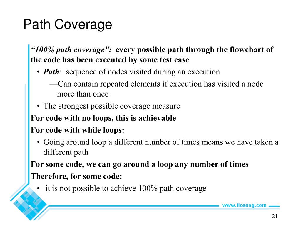 Path Coverage for Loops • Path coverage for many while loops is impossible • Most programs have while loops! • Most have at least one that can be followed an arbitrary number of times: • e.g. A top level loop where we read a command and execute it • Therefore, for most whole programs, we don’t even attempt 100% path coverage • Path coverage is still useful for small sections of code