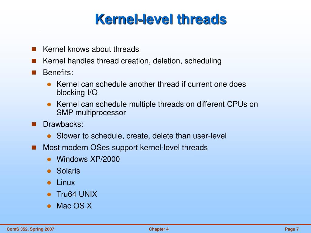 Kernel-level threads • Kernel knows about threads • Kernel handles thread creation, deletion, scheduling • Benefits: • Kernel can schedule another thread if current one does blocking I/O • Kernel can schedule multiple threads on different CPUs on SMP multiprocessor • Drawbacks: • Slower to schedule, create, delete than user-level • Most modern OSes support kernel-level threads • Windows XP/2000 • Solaris • Linux • Tru64 UNIX • Mac OS X