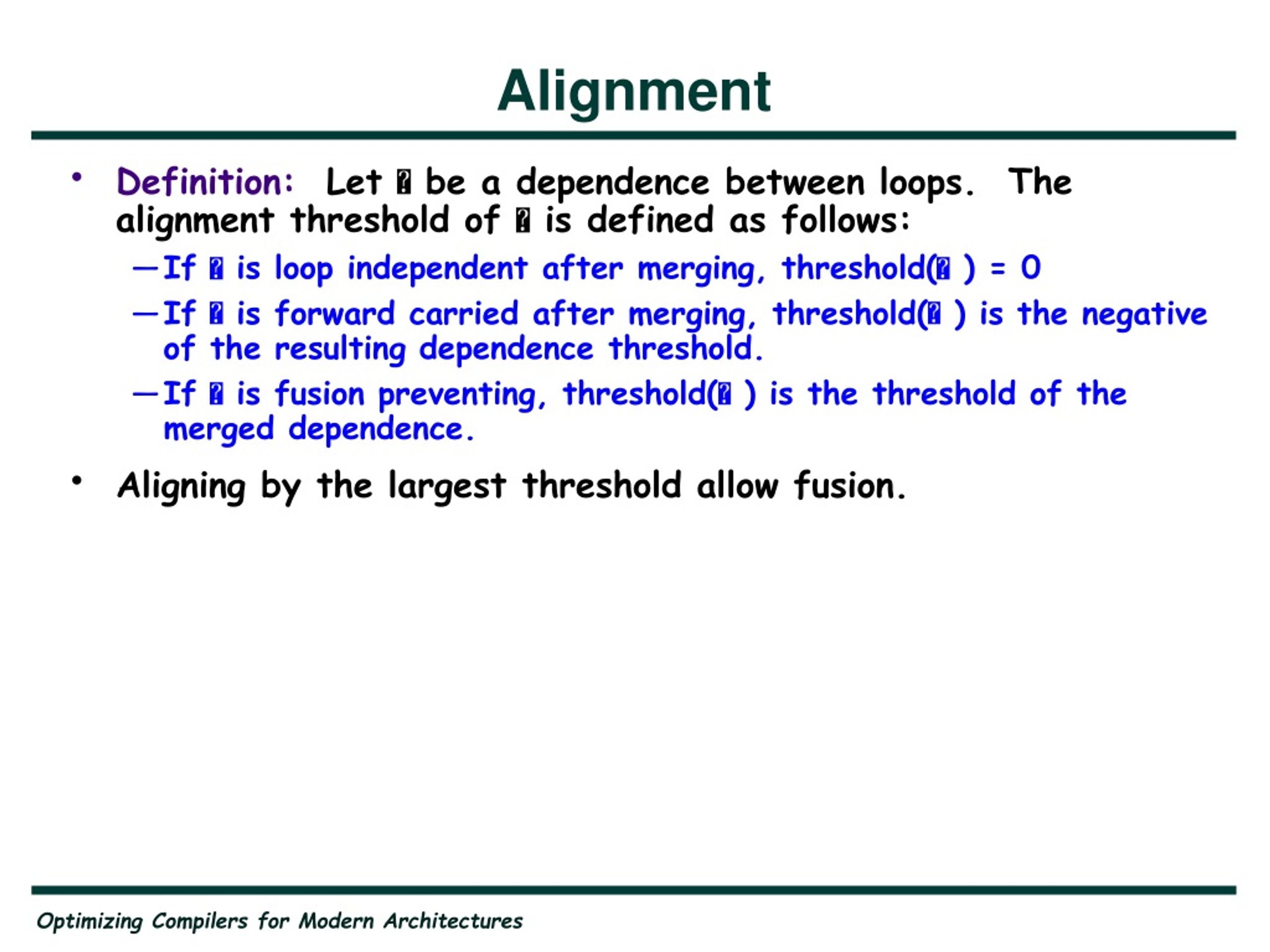 Alignment • Definition: Let be a dependence between loops. The alignment threshold of is defined as follows: • If is loop independent after merging, threshold( ) = 0 • If is forward carried after merging, threshold( ) is the negative of the resulting dependence threshold. • If is fusion preventing, threshold( ) is the threshold of the merged dependence. • Aligning by the largest threshold allow fusion.