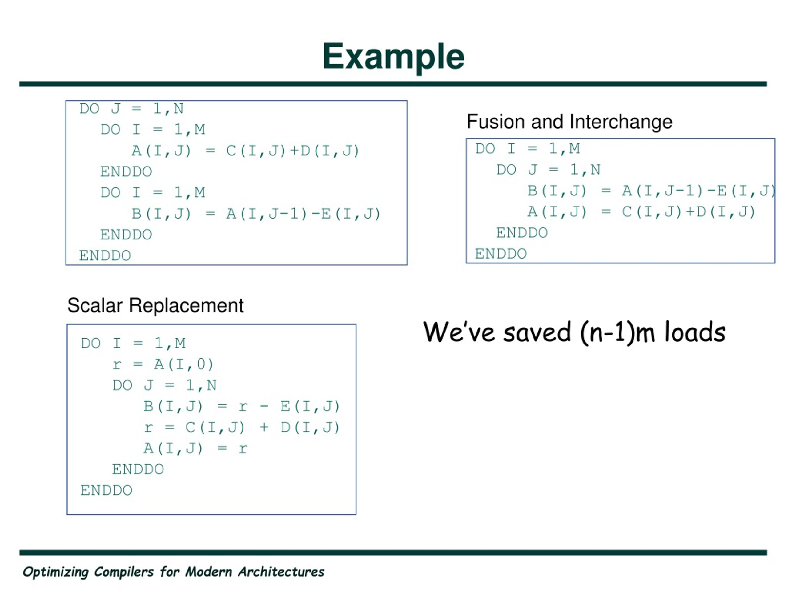 Example DO J = 1,N DO I = 1,M A(I,J) = C(I,J)+D(I,J) ENDDO DO I = 1,M B(I,J) = A(I,J-1)-E(I,J) ENDDO ENDDO Fusion and Interchange DO I = 1,M DO J = 1,N B(I,J) = A(I,J-1)-E(I,J) A(I,J) = C(I,J)+D(I,J) ENDDO ENDDO Scalar Replacement We’ve saved (n-1)m loads DO I = 1,M r = A(I,0) DO J = 1,N B(I,J) = r - E(I,J) r = C(I,J) + D(I,J) A(I,J) = r ENDDO ENDDO